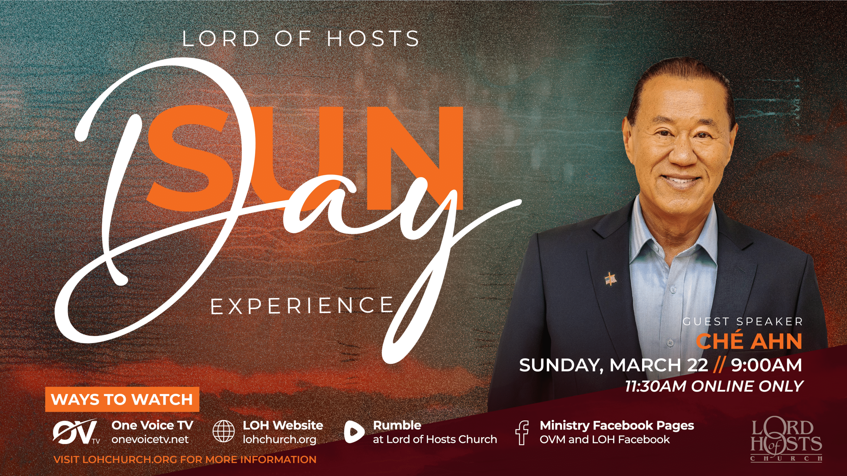 Join us for our 9 AM service on Sunday, March 22, 2026 as we welcome guest speaker Dr. Ché Ahn to Lord of Hosts Church! Don’t miss this powerful time of ministry!