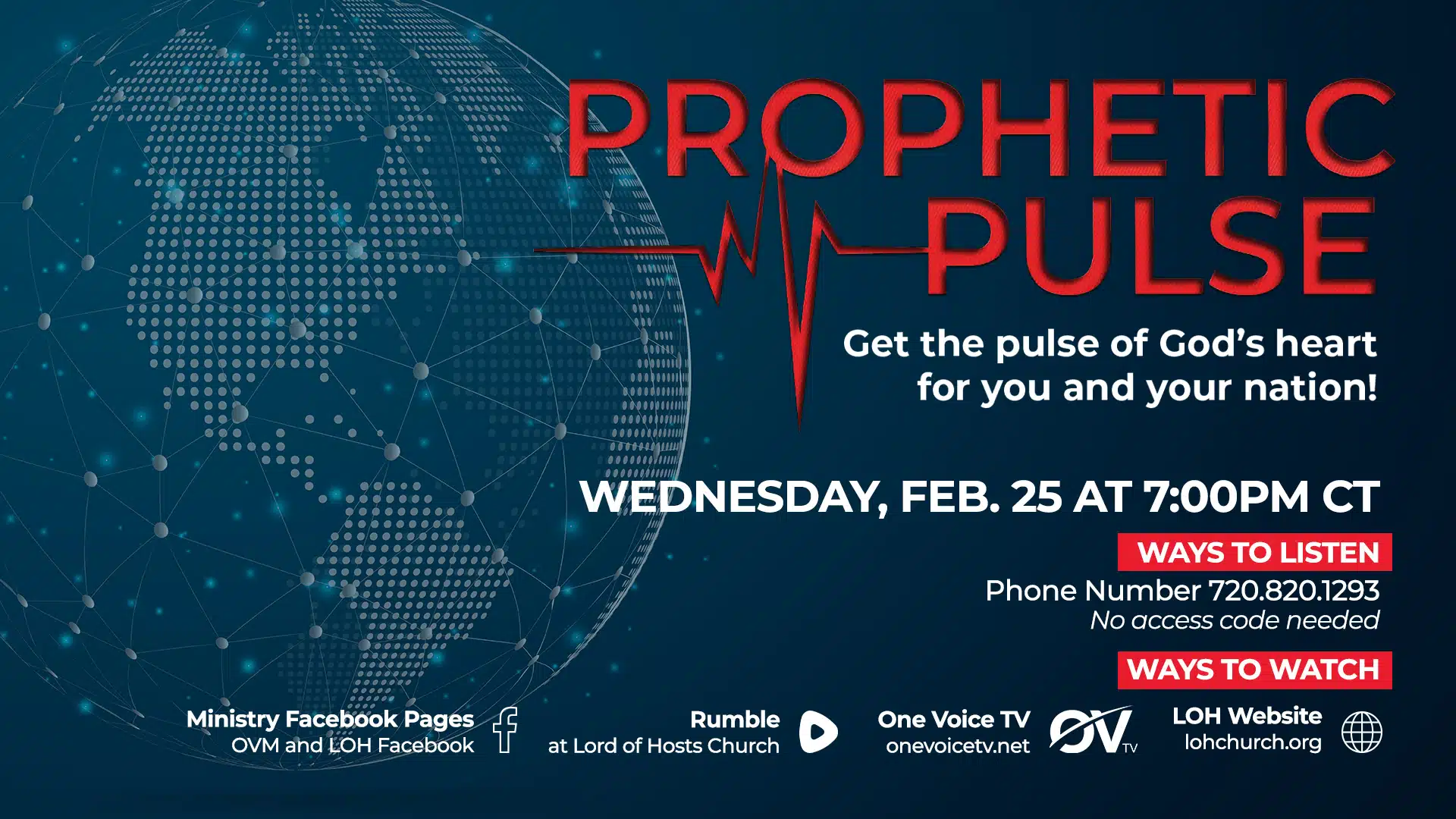 Join us for another powerful Prophetic Pulse as we align with God’s purposes and hear what the Spirit is saying in this crucial hour. Mark your calendars for Wednesday, February 25 at 7 pm CT at Lord of Hosts Church! WAYS TO WATCH If you aren’t able to attend Prophetic Pulse LIVE in person, […]
